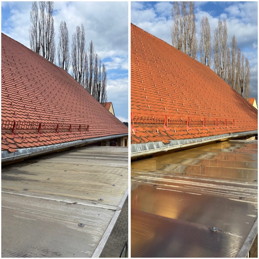 Professionelle Entfernung von Moos Algen und Schmutz schützt Ihr Dach und sorgt für eine saubere langlebige und gepflegte Oberfläche.